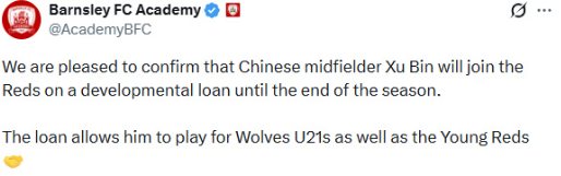 不过,博主英国足球那点事分析,“根据官方公告,徐彬加盟的是巴恩斯利青训学院,并不是巴恩斯利一线队。按这说法应该踢不了英甲。”