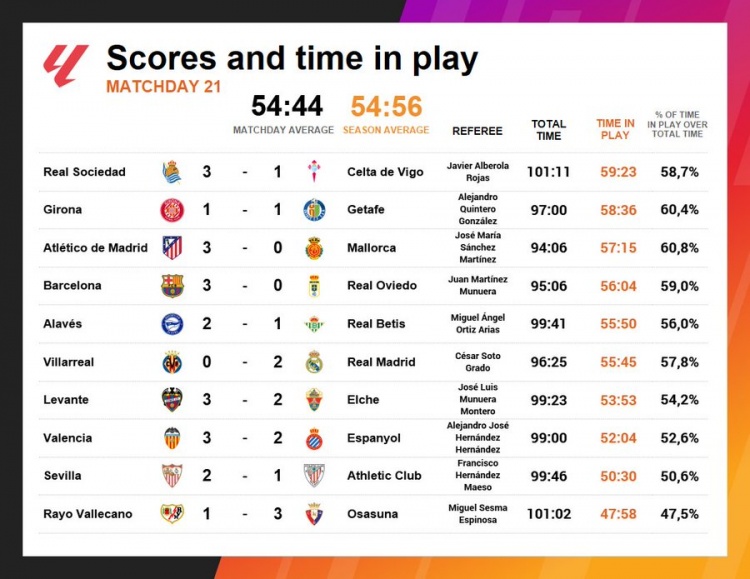 开云体育-西甲第21轮没有任何一场比赛净时间达到60分钟,场均仅为54分44秒