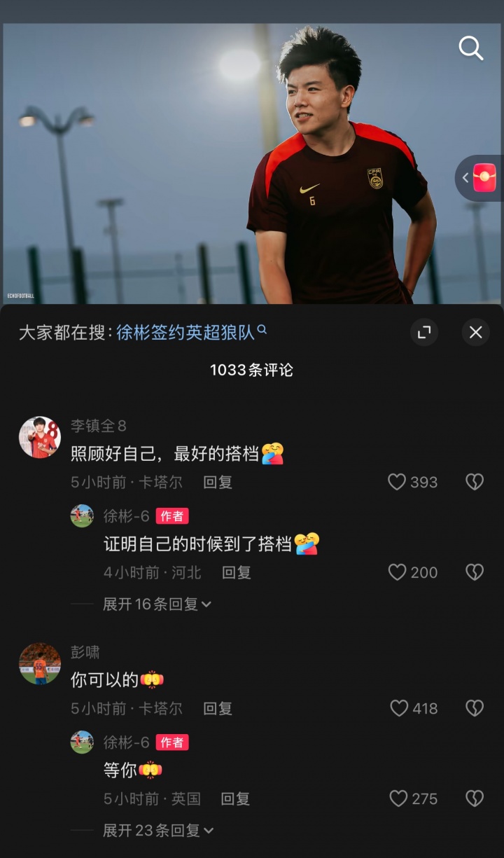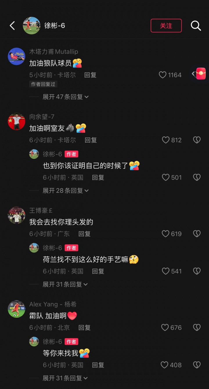 U23国足的队友们在评论区纷纷留言,包括木塔力甫、向余望、王博豪、杨希、李镇全、彭啸等人,其中木塔力甫评论“加油狼队球员”,徐彬一一回复,IP显示已在英国。